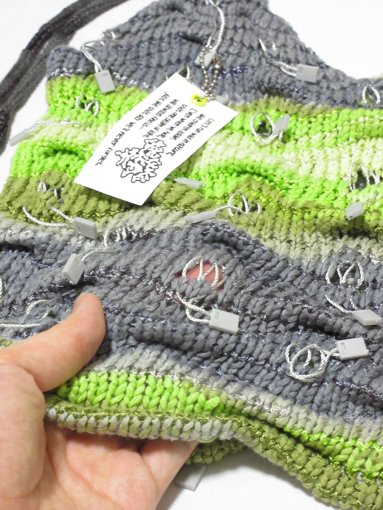 タグを編み込み、デザインとしてのアクセントと揺れる度に表情が変わり、1枚でもスタイリングの主役になります