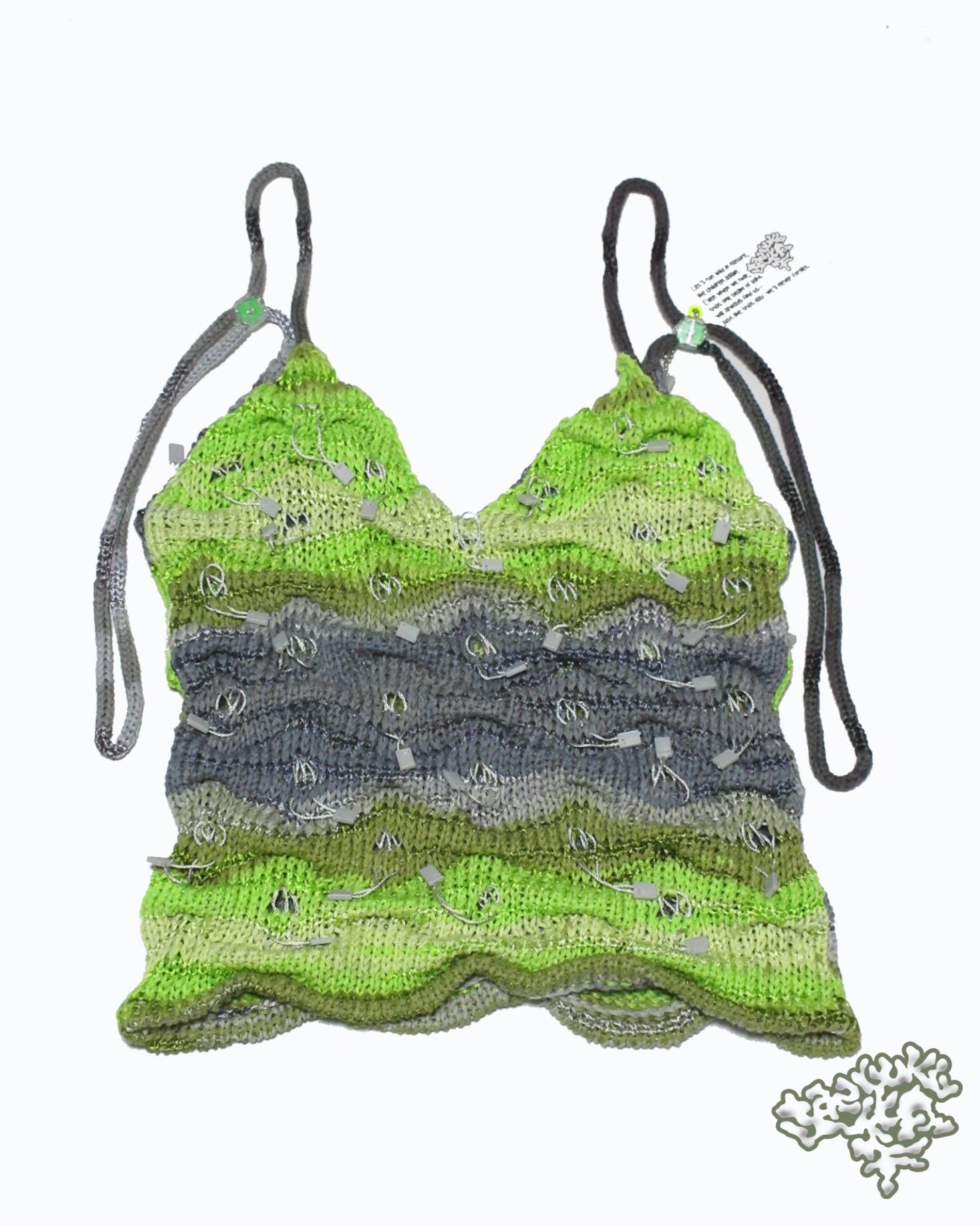 素材はコットンをベースに、迷彩のような森を思わせるグラデーションの糸で編み上げたニットキャミソール。