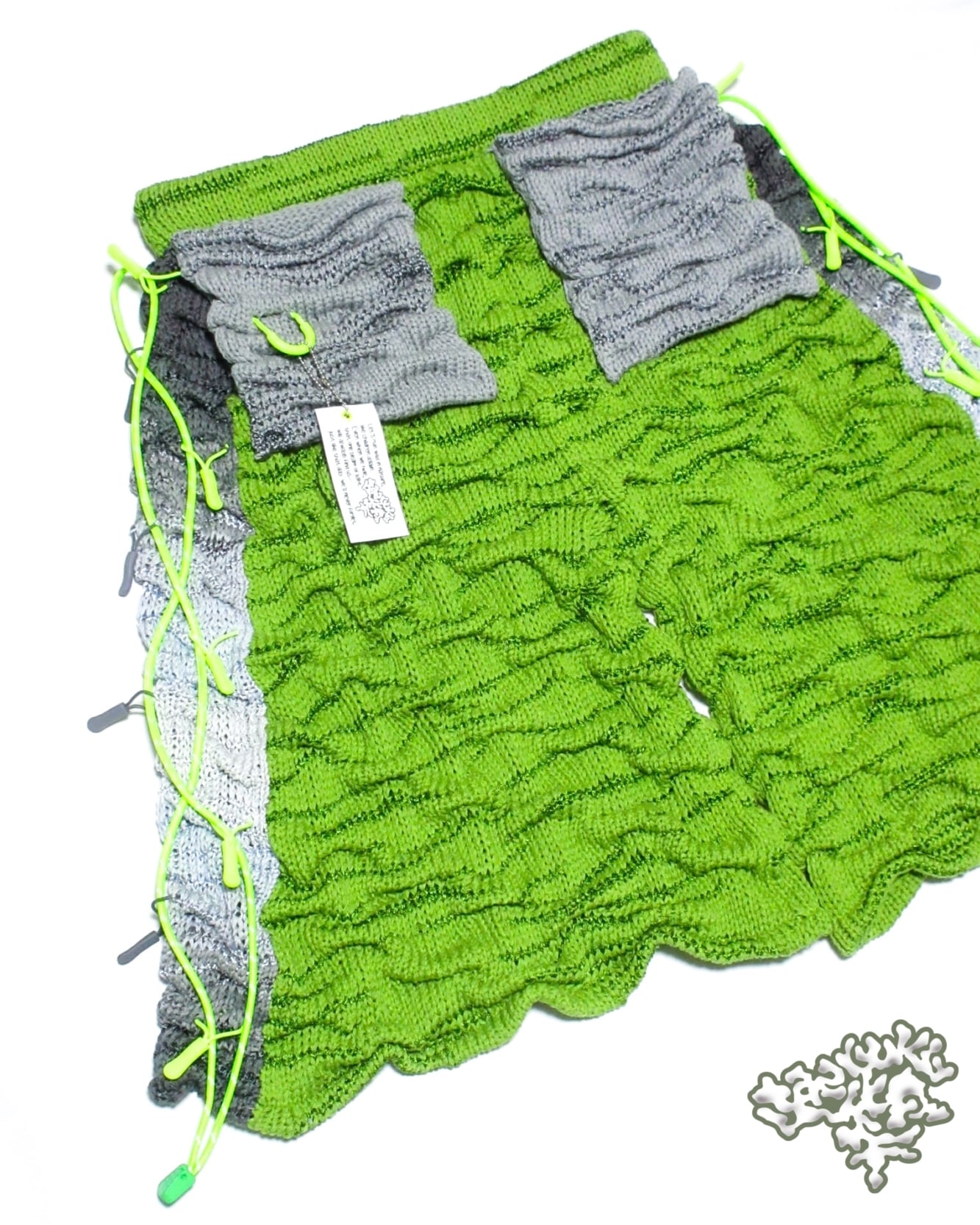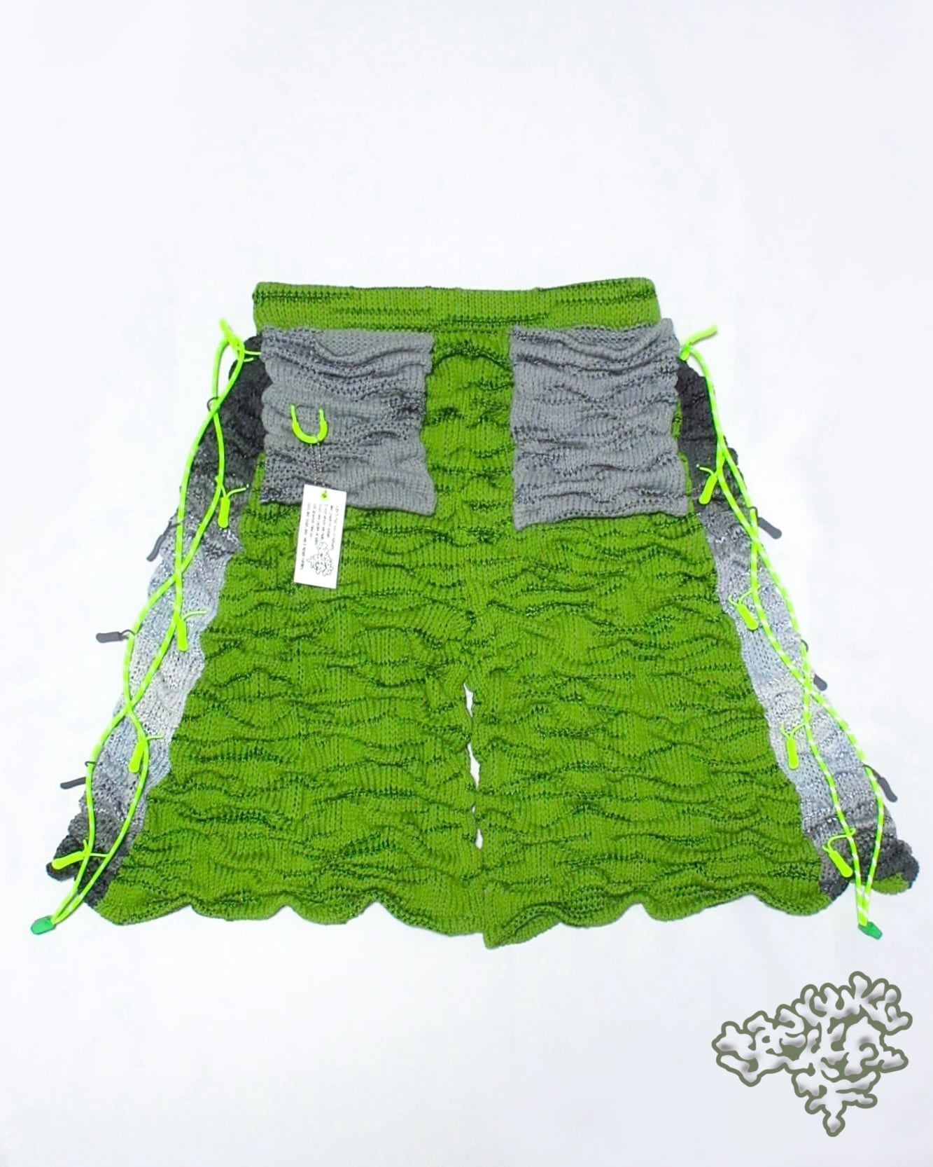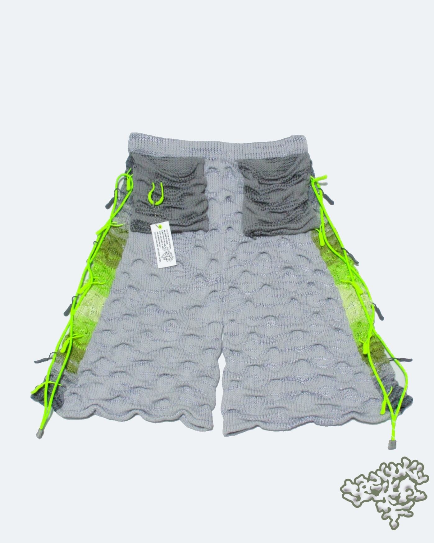 コットンベースに光沢のある糸がミックスされた、光の加減で迷彩柄のように見えるニットハーフパンツ